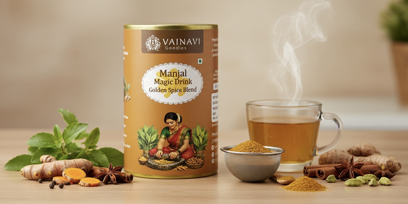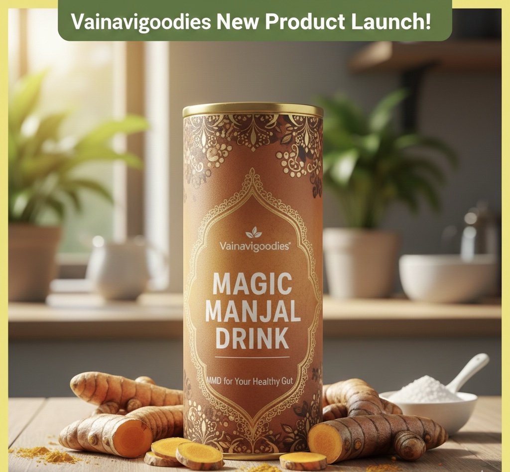 Experience the “Magic” of ancient wellness in every sip. Vainavigoodies Magic Manjal Drink is a masterfully blended infusion of premium Erode turmeric and potent botanicals, designed to reset your digestive system and boost your natural vitality.